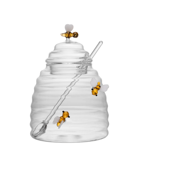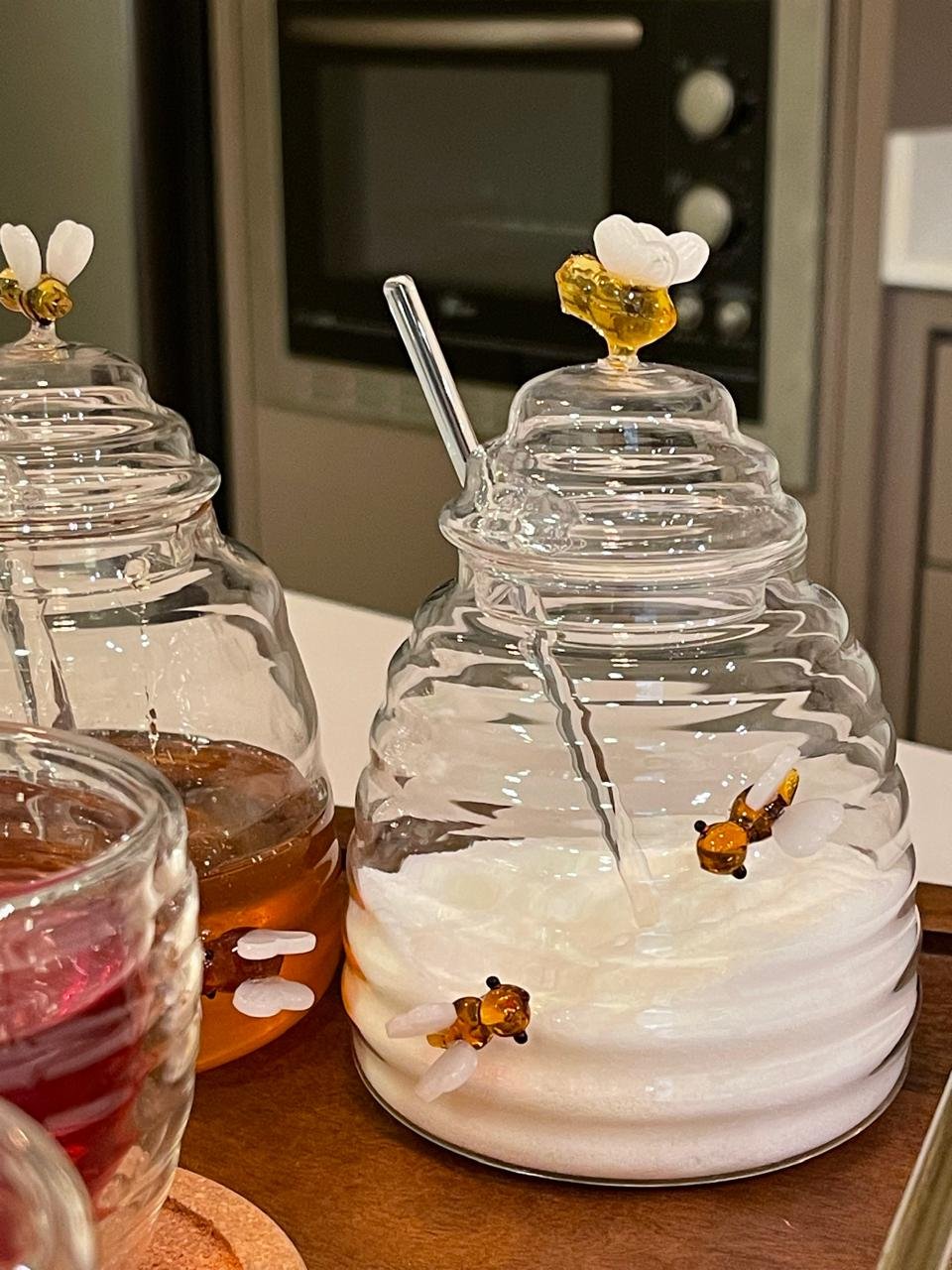 O detalhe em formato de abelha na tampa e a colher inclusa conferem um toque delicado e sofisticado à peça, tornando-a um destaque na sua cozinha ou mesa de café da manhã.