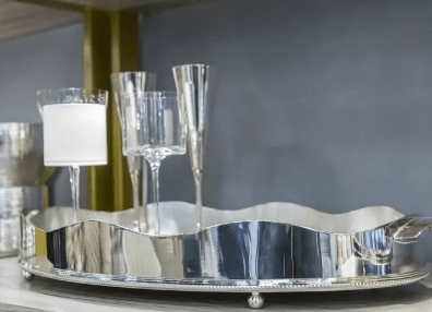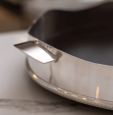A Bandeja em Prata recebe banho de prata previamente endurecida e abrilhantada, que garante maior durabilidade e facilidade na manutenção.