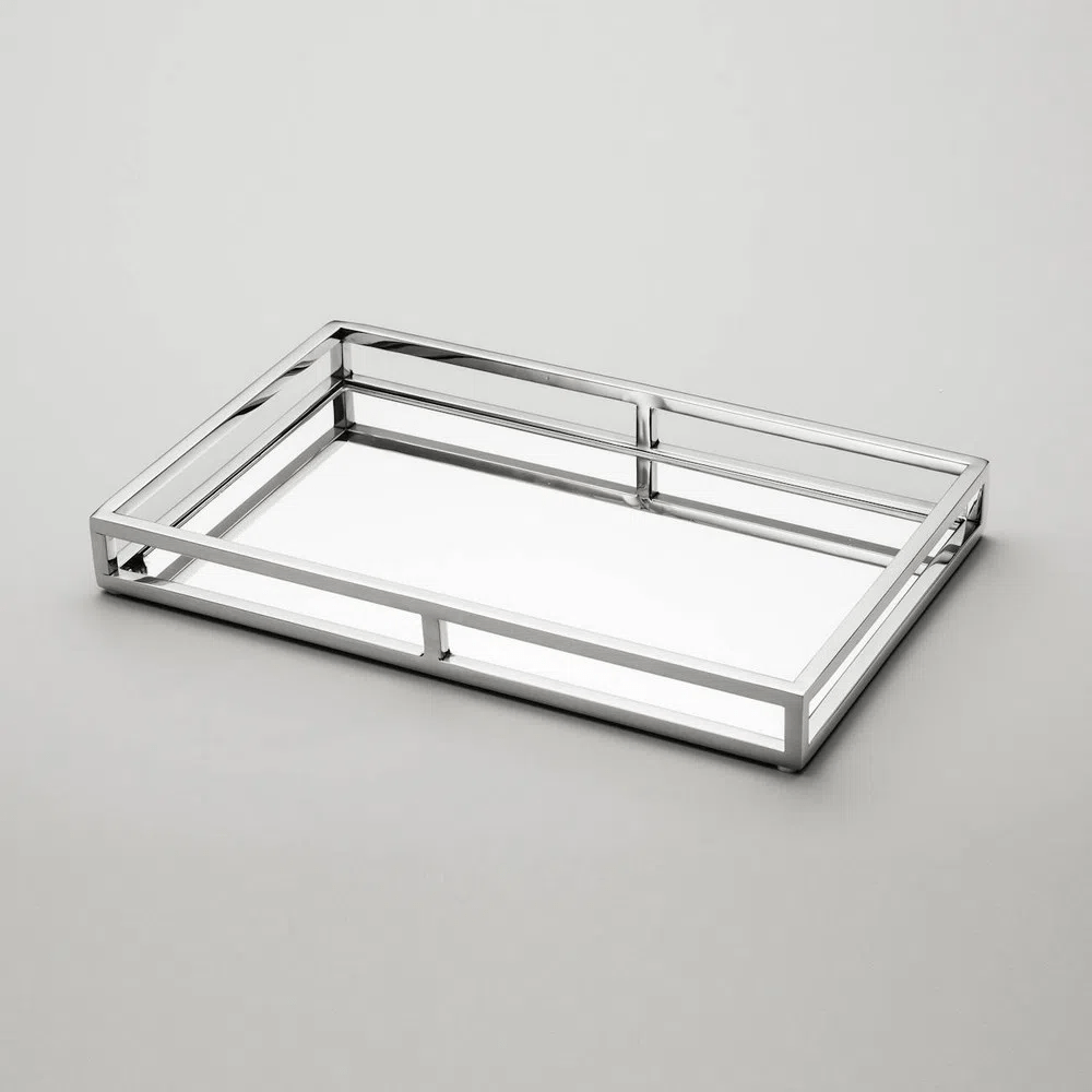 A bandeja possui fundo espelhado e estrutura em metal prateado. Seu design moderno e sofisticado, é ideal para compor a decoração do seu espaço. Deixe que sua imaginação a leve além e agregue seu ambiente com elegância e modernidade.