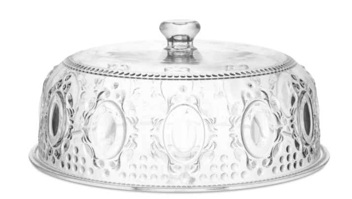 Boleira em acrílico transparente, com design inspirado no barroco e detalhes em relevo que garantem elegância à mesa, ideal para servir bolos, tortas ou sobremesas, unindo praticidade e sofisticação.