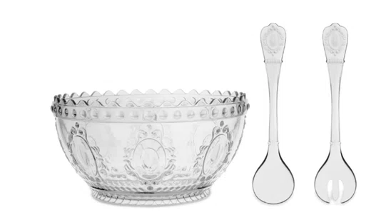 Saladeira com talheres em acrílico transparente, com design inspirado no barroco e detalhes em relevo que trazem sofisticação à mesa, unindo elegância e praticidade.