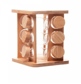 O kit acompanha 12 potes de vidro borossilicato e 1 rack giratório de bambu