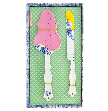 A espátula de bolo da Royal tem aproximadamente 25x8cm e a faca 24x2cm. Ambas são feitas com a mais delicada porcelana e vem embaladas em uma linda caixa.