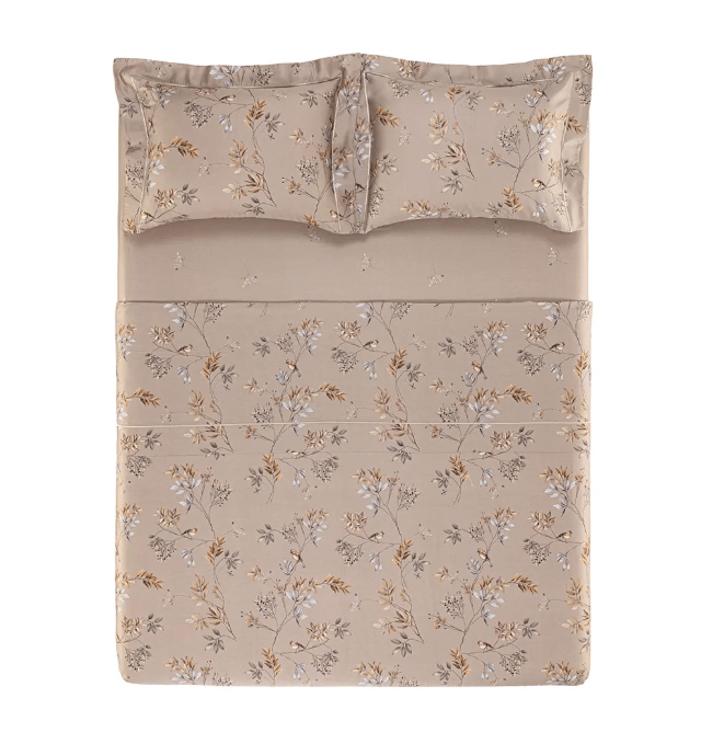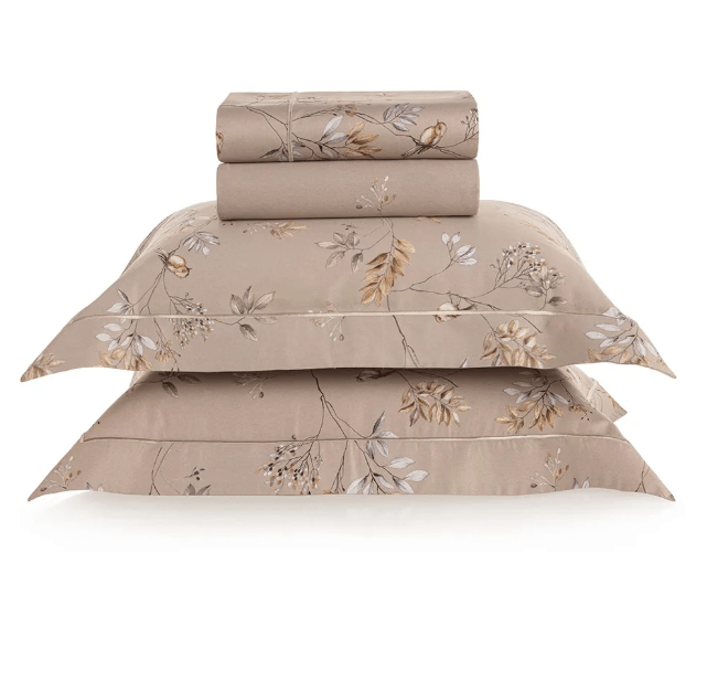 - Acabamento: Tecido sanforizado e mercerizado; Fronhas com 3 abas; Sobre lençol com dobra feita; Acabamento com ponto royal; Lençol com elástico estampado;