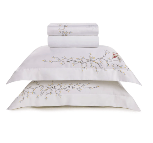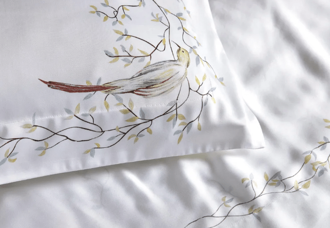 - Combinação de Cores: Corpo branco com estampa dimensionada exclusiva na fronha formando o lado ele/ela representando um pássaro dançando sobre folhagens azuis e amarelas em um emaranhado de galhos. O sobre lençol, apresenta a mesma folhagem em sua frente e um emaranhado de galhos conectados na dobra feita
