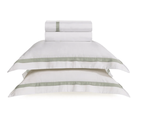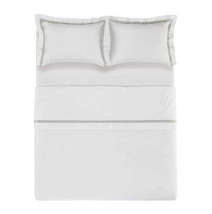 - Acabamento: Tecido mercerizado ,Fronha com 3 abas duplas; Dobra feita com pala dupla; Lençol de baixo com elástico liso; Toque acetinado