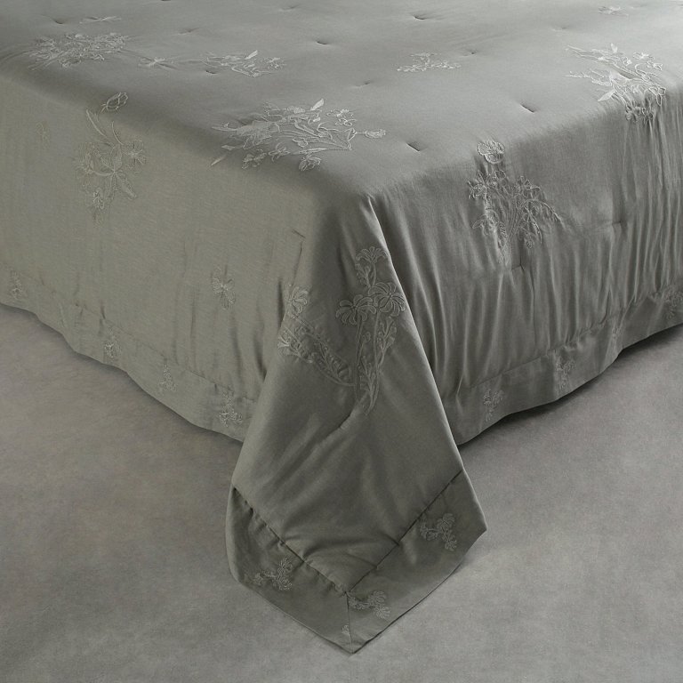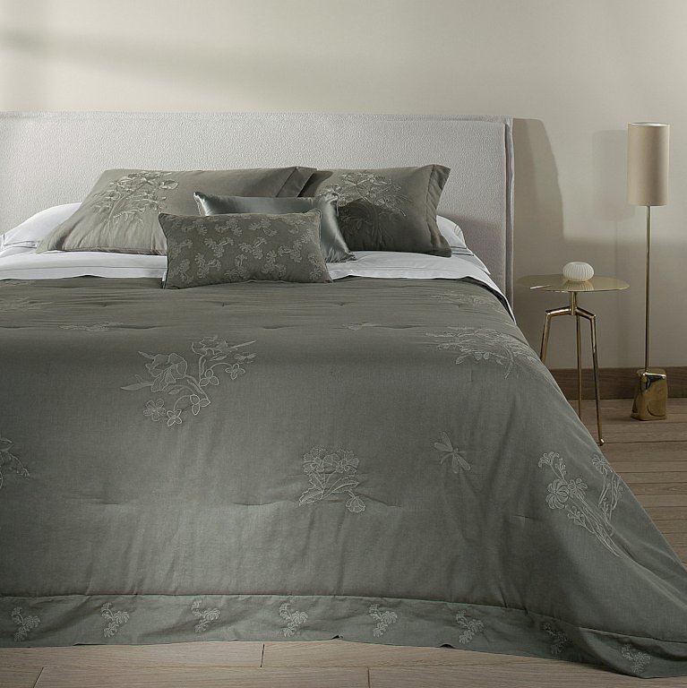 Colcha bordada com porta travesseiros produzida em 55% linho e 45% algodão, volumosa como edredom.