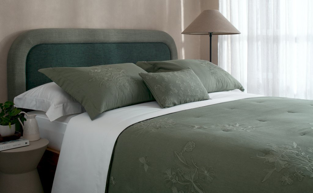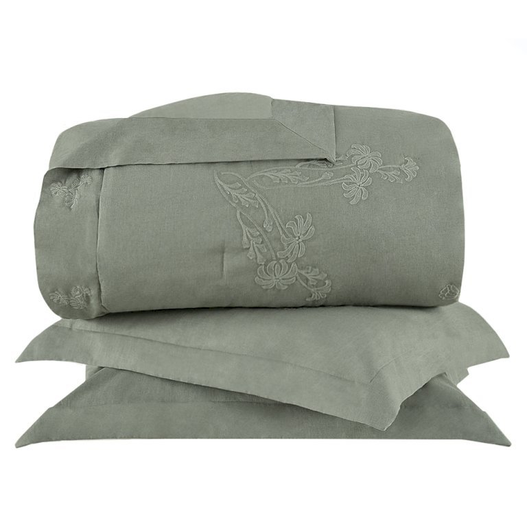 Porta travesseiro dispõe de abas nos três lados - Almofada bordada verde safari, 55% linho e 45% algodão - Única e muito especial, a Colcha Philippe reúne a beleza e a ancestralidade das peças em linho. Bordados florais, em ton sur ton verde safari, preenchem as laterais do modelo conferindo charme e nobreza.