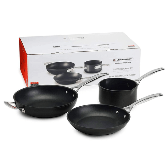 - Conjunto de Frigideiras Rasa 24 cm, Funda 26 cm e Leiteira 16 cm Tns Pro Stick 4X Mais Forte Le Creuset Dimensões: Frigideiras Rasa 24cm, Frigideira Funda com Alça 26cm e Leiteira 16cm Material: Alumínio Non-Stick Fonte de Calor: Gás/Elétrico/ Vitrocerâmico /Indução