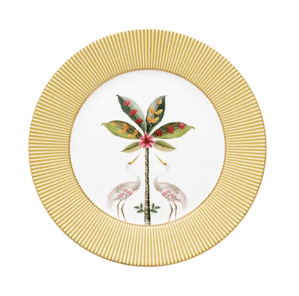 Adicione este prato sobremesa La Majorelle à sua coleção de porcelanas. O prato fundo um branco e é decorado com o alegre desenho da La Majorelle. Uma palmeira exótica cercada por duas garças estão estampadas neste item incrível. A borda do prato é adornada com listras amarelas e brancas que, junto ao detalhe dourado na borda de fios de ouro, dão ao produto um toque elegante. Nossa porcelana La Majorelle vai fazer sua cristaleira e sua mesa brilharem!