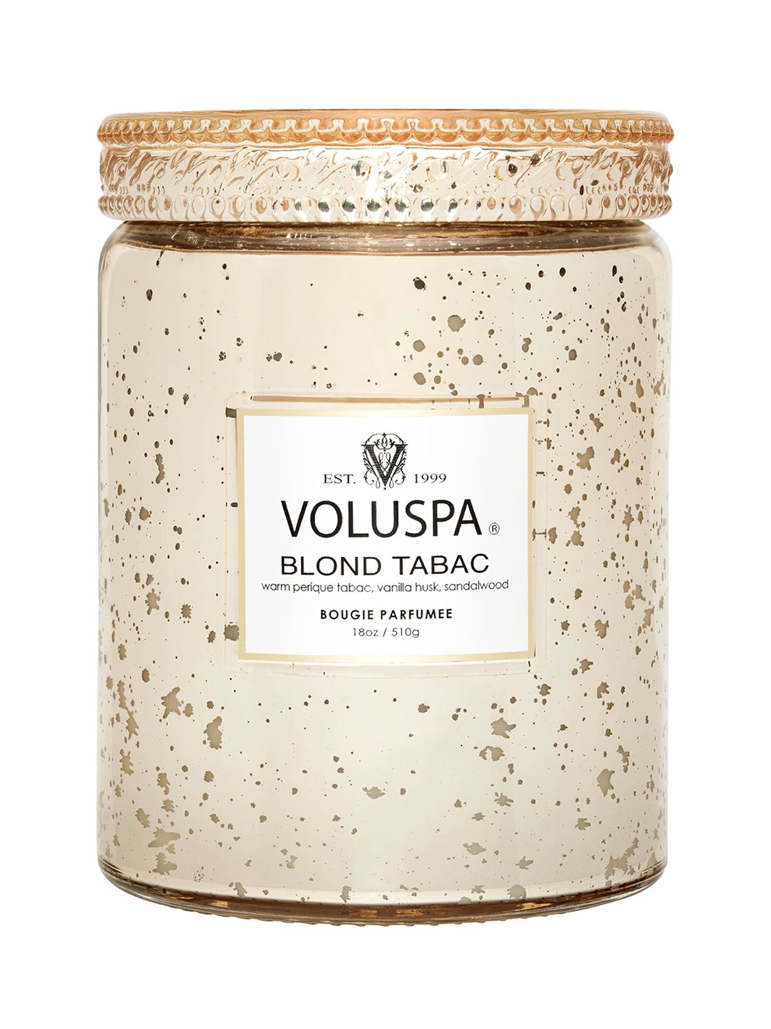 Uma mistura única de cera criada pela Voluspa utilizando um blend de ceras naturais de coco e damasco, numa linda embalagem de vidro com os detalhes da linha Vermeil, com tampa para manter suas velas organizadas e limpas.