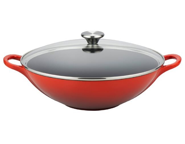 O design asiático clássico da Panela Wok em ferro fundido da Le Creuset apresenta uma superfície de cozimento interior curva, lisa e contínua, ideal para refogar, saltear legumes e carnes grelhadas, e tem um peso perfeitamente equilibrado e uma base plana. A adição da tampa de vidro temperado bloqueia a umidade para cozimento a vapor. Especialmente formulado para cozimento em temperatura de superfície mais alta, o esmalte interior acetinado preto desenvolve uma pátina natural que é praticamente antiaderente com o tempo. A superfície esmaltada colorida minimiza a colagem e manchas, não requer nenhum pré-tempero e é fácil de limpar.