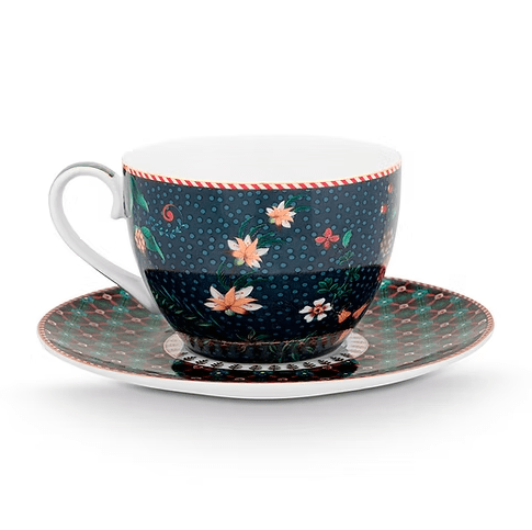 Esta xícara de chá faz parte da nossa coleção Berry Blues. A xícara é decorada com um design floral azul escuro com galhos nos quais crescem elegantes flores de fantasia e frutas vermelhas. O pires é decorado com um padrão de azulejo verde escuro com detalhes em vermelho, que lembra os famosos xadrezes de inverno. As bordas são finalizadas com detalhes dourados e uma surpreendente listra vermelha e branca, dando um visual extra quente e aconchegante.