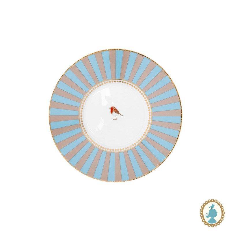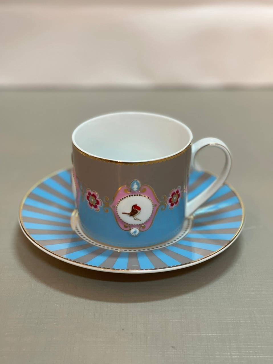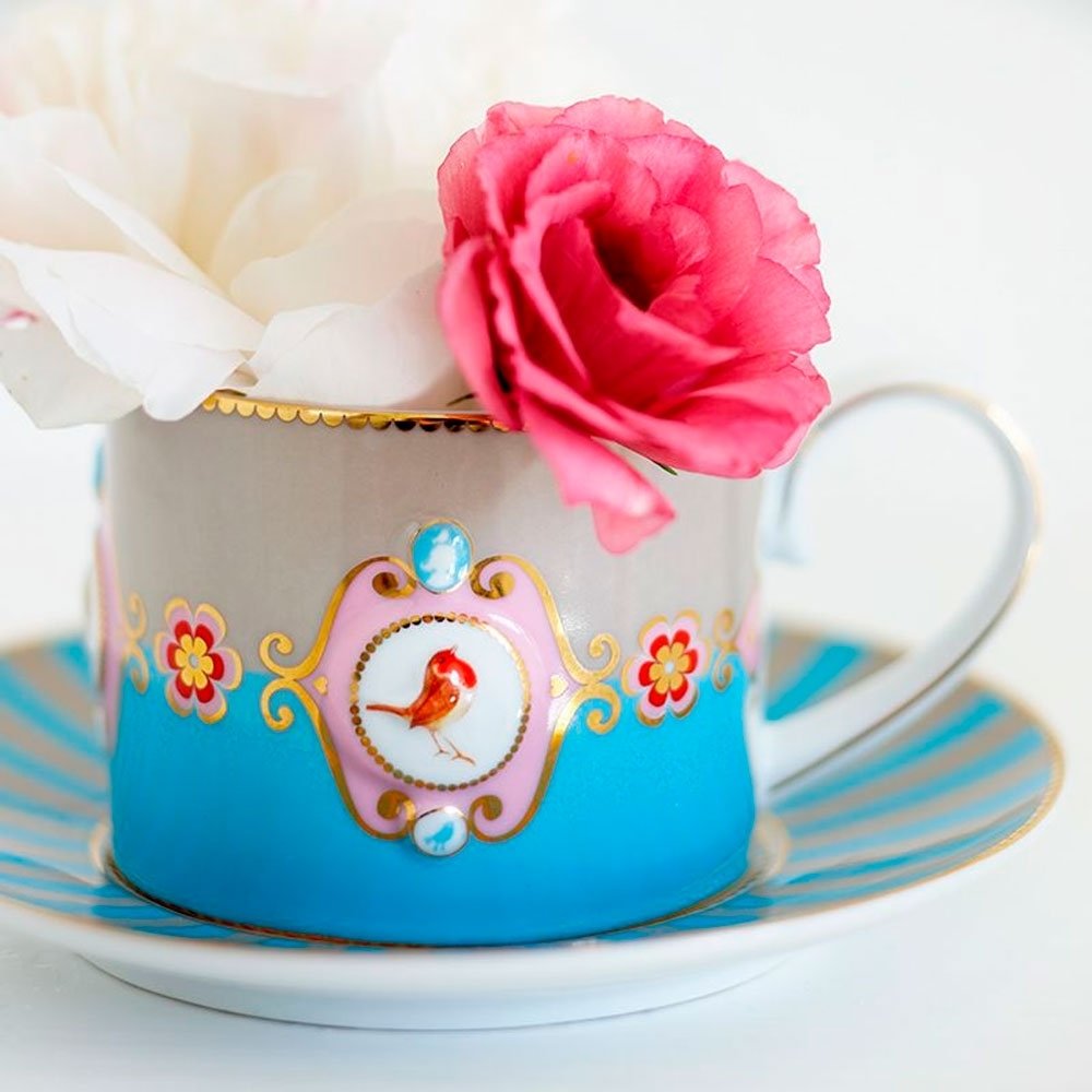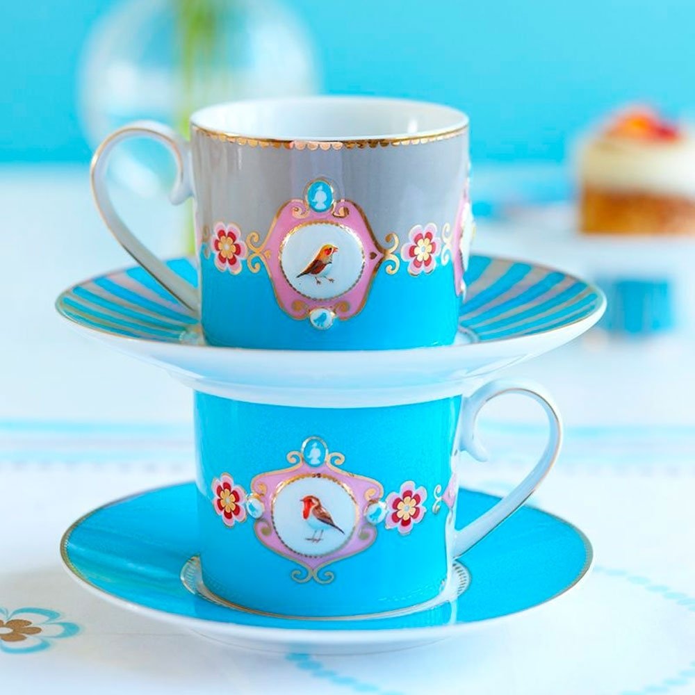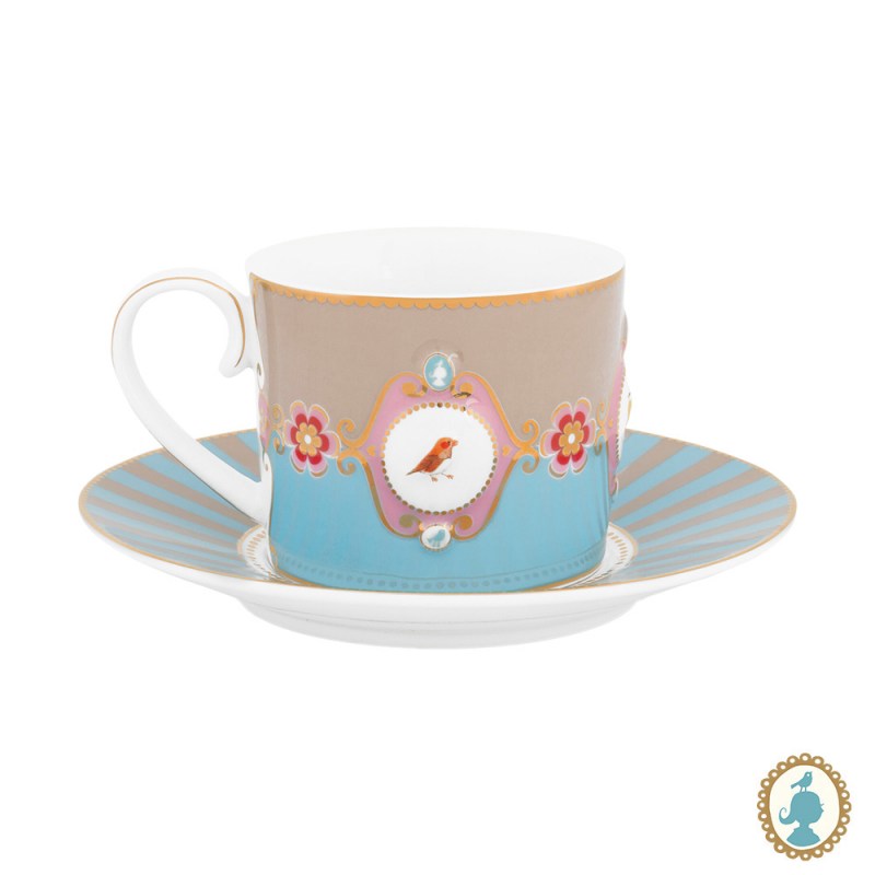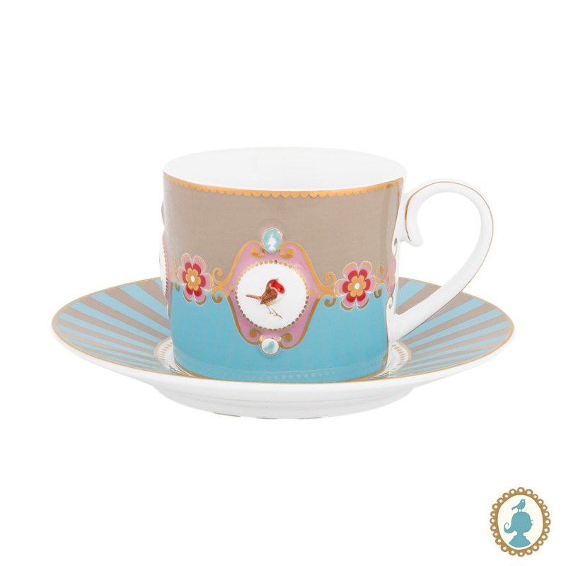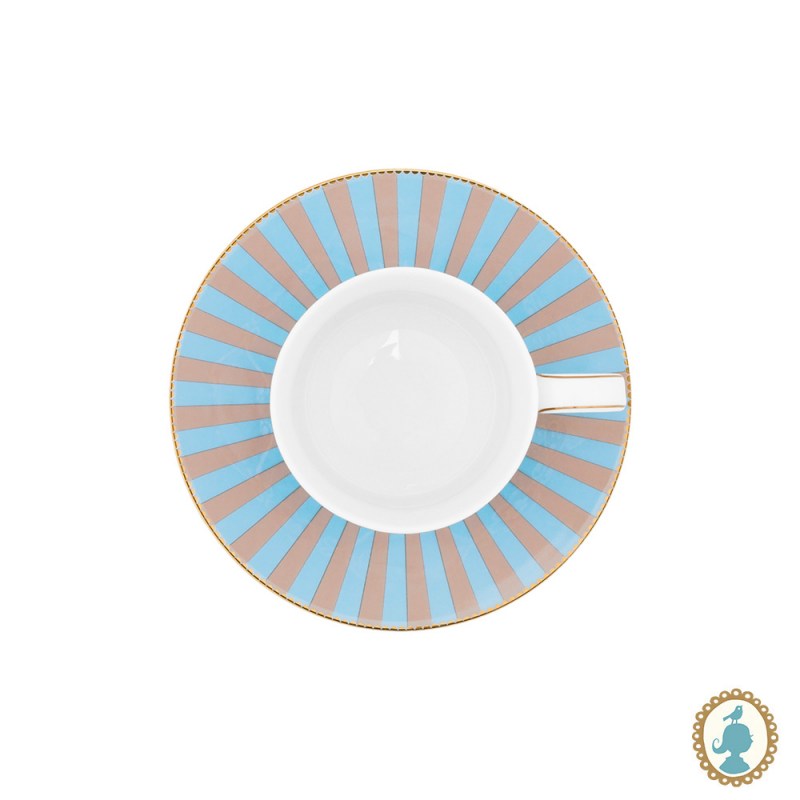 Xícara com pires listrados azul e cáqui, favorito design de todos os tempos da Pip. O medalhão, o pássaro e elementos decorativos em dourado deixam o design das peças ainda mais elegantes. Esse set tem o tamanho perfeito para sua bebida quente. Cada copo é decorado com elementos luxuosos, como o acabamento em fios de ouro na alça. A xícara tem capacidade de 200ml.